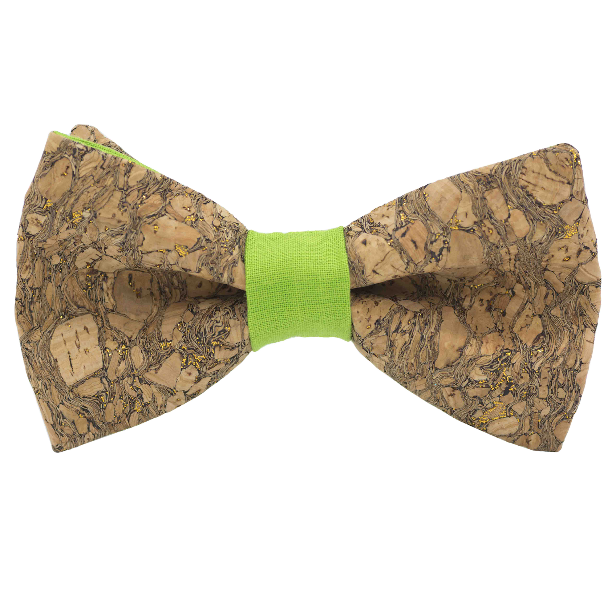 Nœud papillon liège « Chardonnay » à paillettes dorées – bague vert pomme